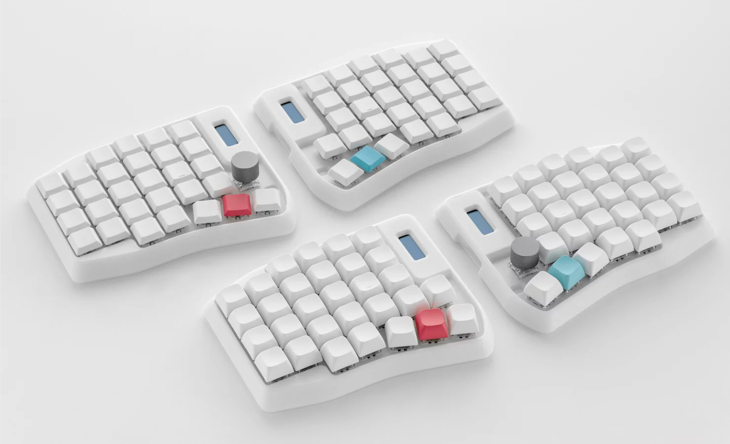 Каждая половинка имеет дополнительные клавиши для безымянного и среднего пальцев, одну клавишу или энкодер для указательного пальца и экран.